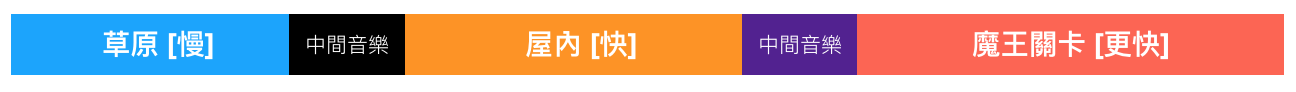 從上面的音軌變化圖可以看到,草原、屋內與魔王關卡共有三段音樂,這三段是連在一起的。當主角從草原進到屋內,中間需要一個黑色的段落,這段落是比較慢的,因為當主角從草原進到屋內後,音樂速度也會變快,透過中間音樂的緩衝,讓兩個場景的曲子連貫在一起。不管是從草原進到屋內、從屋內走回草原,或是從屋內進到魔王關卡,都需要中間音樂來緩衝。