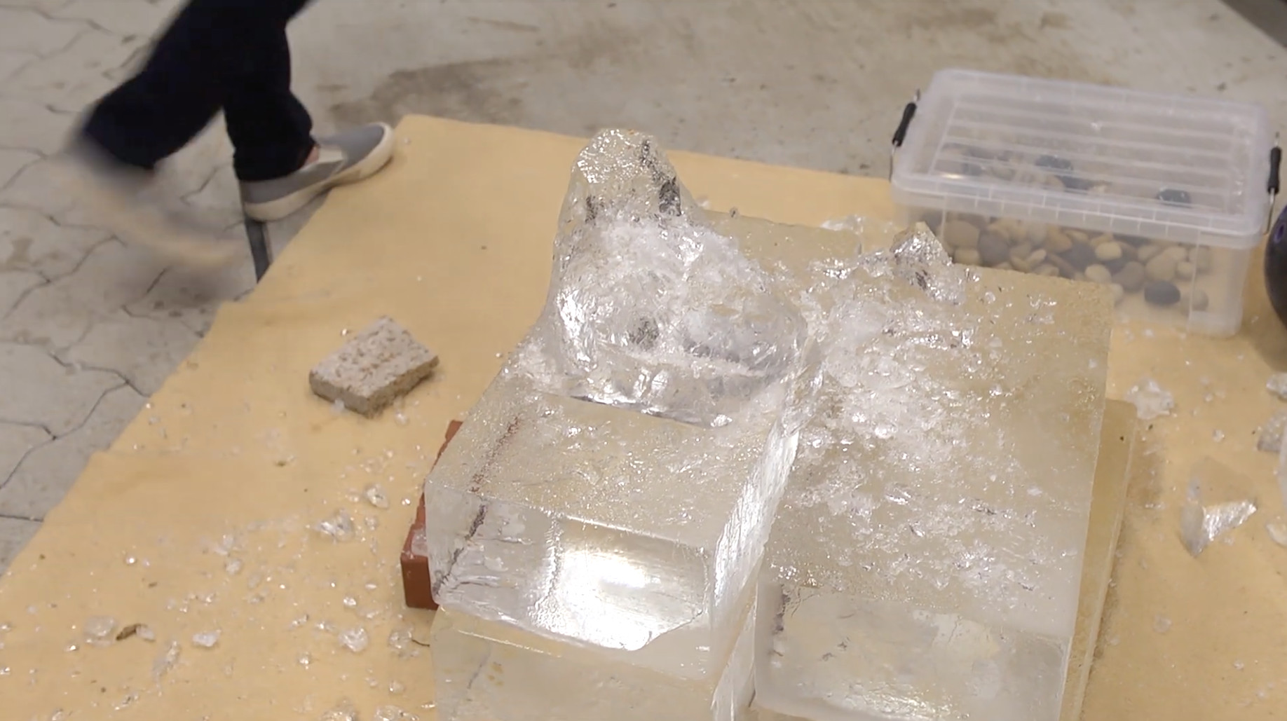 最後黒岩若菜決定用冰塊來 Foley 冰龍的音效。首先在冰磚上放著磚塊,然後一錘敲下去後,所產生的碎石聲就用來做為冰龍的聲音,她說這樣敲出來的聲音會有更多細節。