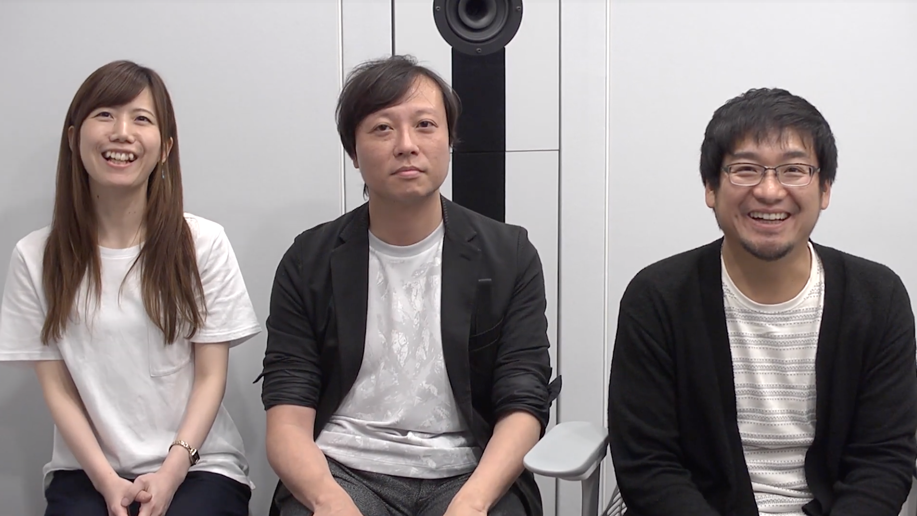 本次受訪者共有三位,分別是遊戲監督藤岡要(右)、聲音設計師黒岩若菜(左)以及作曲家成田明彥(中)。