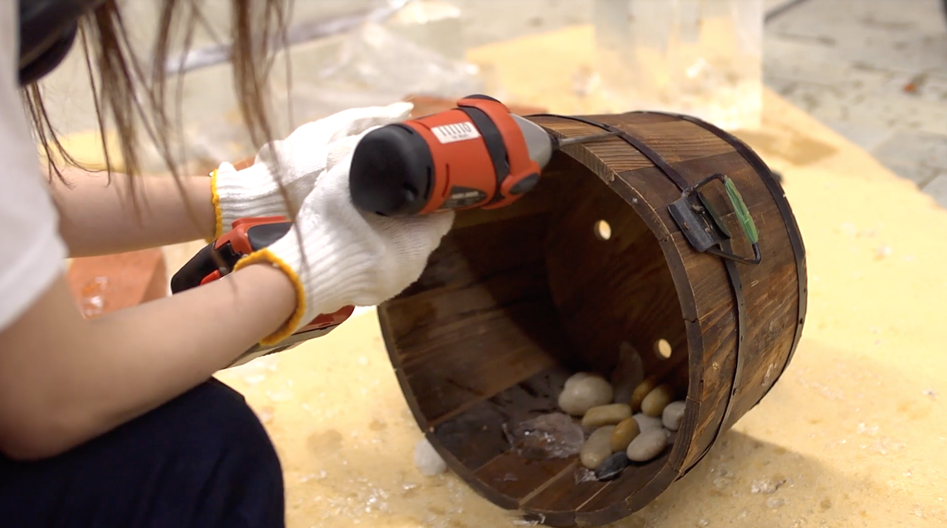 另外為了模擬凍魚龍在積雪中游來游去的聲音,他們設計了類似「除雪車」的音效,首先用電鑽在木桶的邊緣摩擦,另外在木桶內擺放東西,來改變聲音殘響的效果。