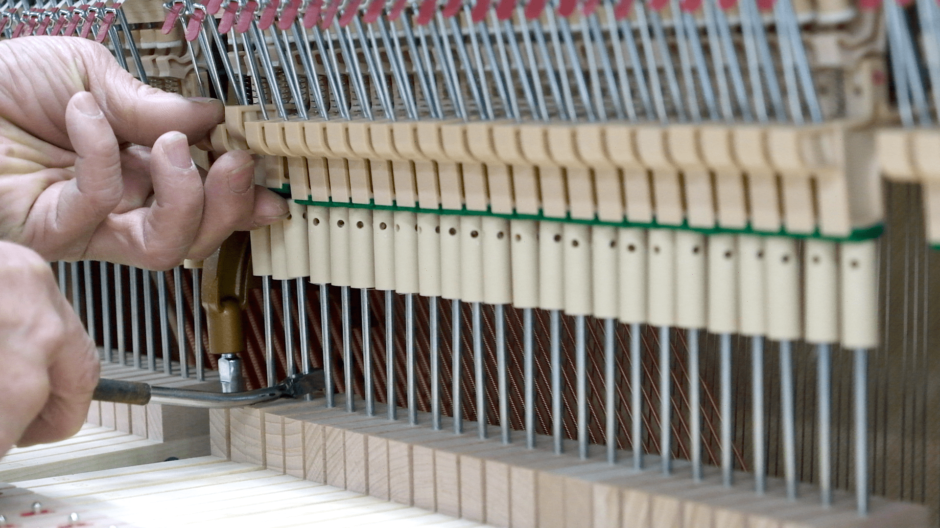 在安裝完打弦器後,會先用電熱鉗調整琴槌棒,使琴槌後部成一直線,並能同時精準地敲擊在琴弦上;此外,為了讓演奏者有更好的手感,高度也是必須調整的。師傅會透過器材輔助來調整琴鍵的高度,過高的會取出打磨調整;除了讓琴鍵水平一致外,也會使用墊片來調整按壓時的下壓深度。